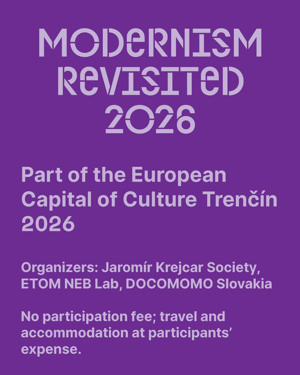 Modernism Revisited 2026, held within the official programme of ECOC Trenčín 2026, invites scholars, architects, planners, educators, researchers, and policymakers to reflect on how modernist architecture, landscape, and planning visions can be reinterpreted and reactivated in the twenty-first century. The conference seeks an interdisciplinary dialogue across time and scale—linking architectural form with territorial context, and historical experience with contemporary and future scenarios. This conference is organised by the Jaromír Krejcar Society and the ETOM NEB Lab partnered with DOCOMOMO Slovakia.