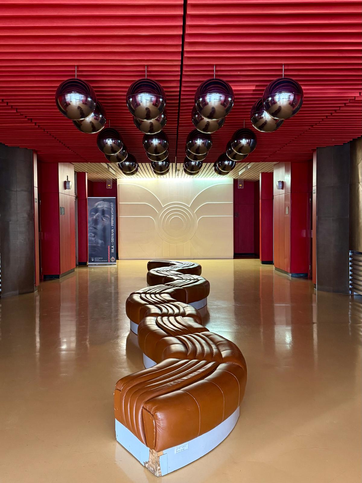 Interior spaces include original design elements and artworks, most notably a monumental mural by artist František Gajdoš in the foyer.